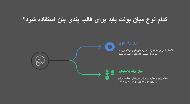 قبل از هر چیز، مشخص کنید که چه نوع میان بولتی برای پروژه شما مناسب است. نوع و اندازه دیوار، فشار جانبی بتن و شرایط محیطی را در نظر بگیرید.